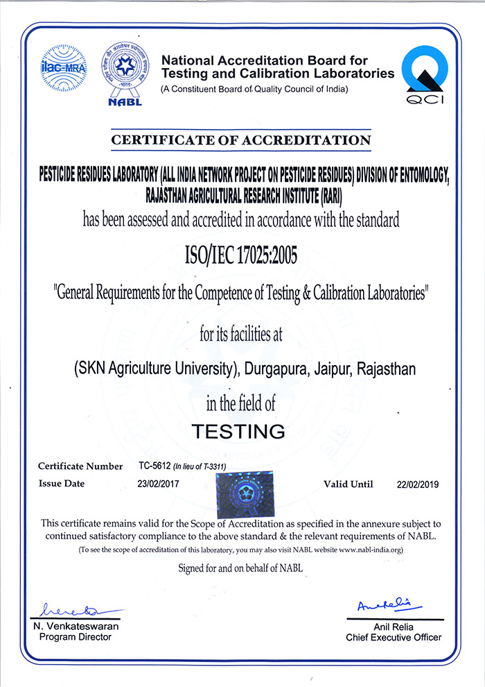 This laboratory got accreditation by NABL under ISO/IEC 17025:2005 valid until 22.02.2019 for performing pesticide residue analysis in different food commodities in conformity with international standards. NABL is the autonomous body of the Govt. of India to grant accreditation to testing and calibration laboratories by assessing their technical competence, managerial organization, laboratory environment and quality system.