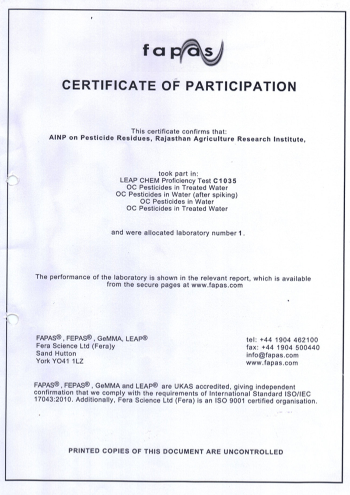To overcome the problem of widespread contamination of food commodities, water, soil and biological samples in India with residues of pesticides, ICAR initiated AINP on Pesticide Residue during 1984-85. There are fifteen research projects on pesticides residues throughout India. In Rajasthan the work on Pesticide Residue was started at Rajasthan Agricultural Research Institute, Durgapura, Jaipur.